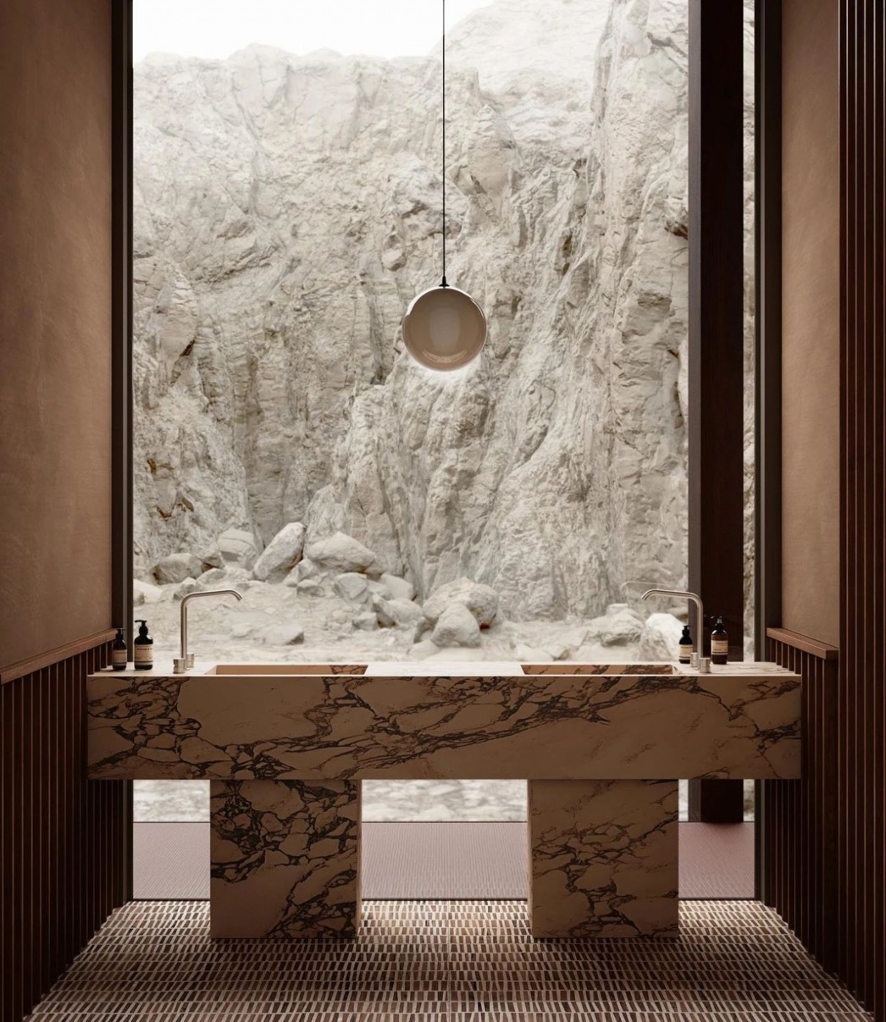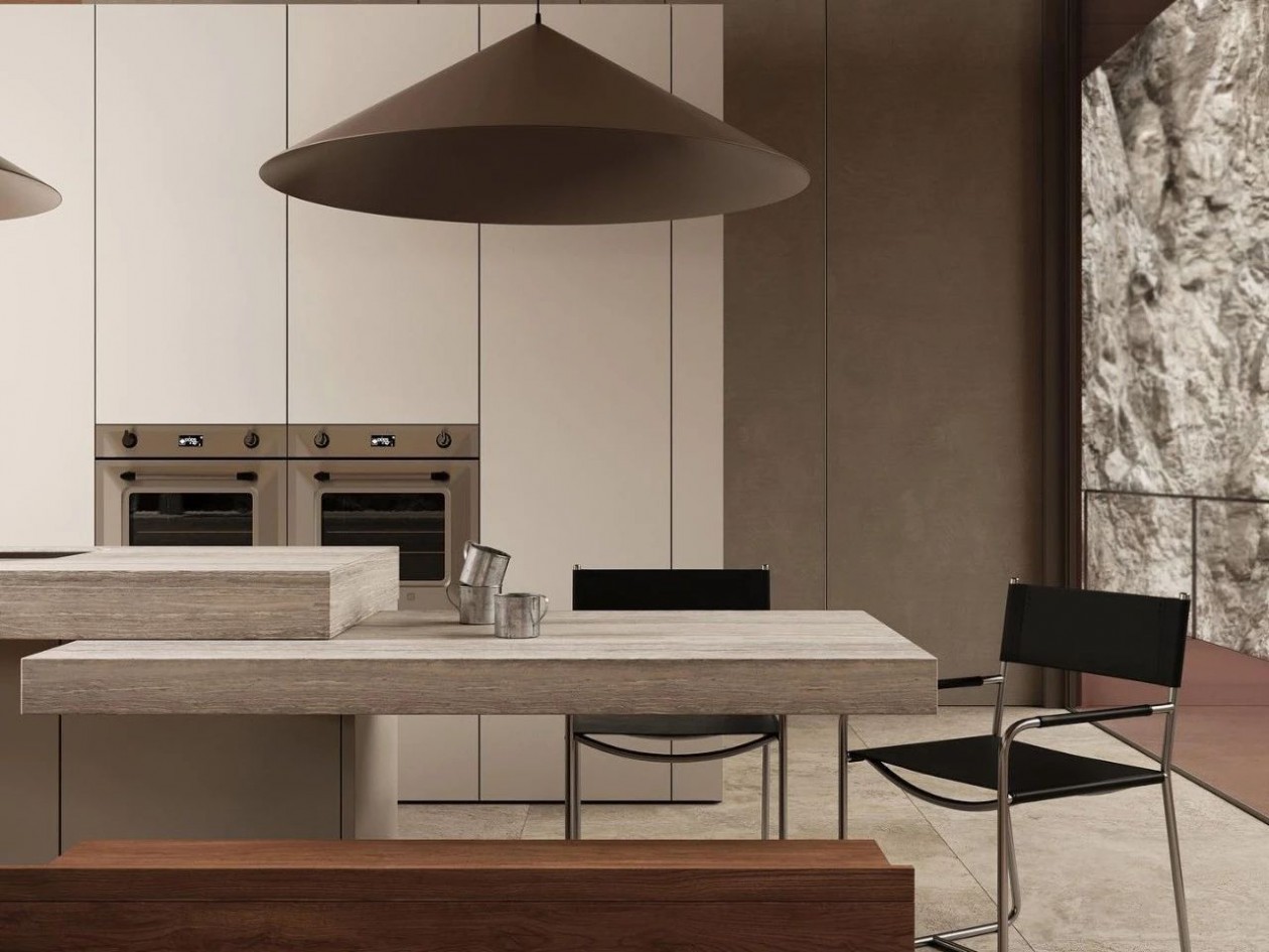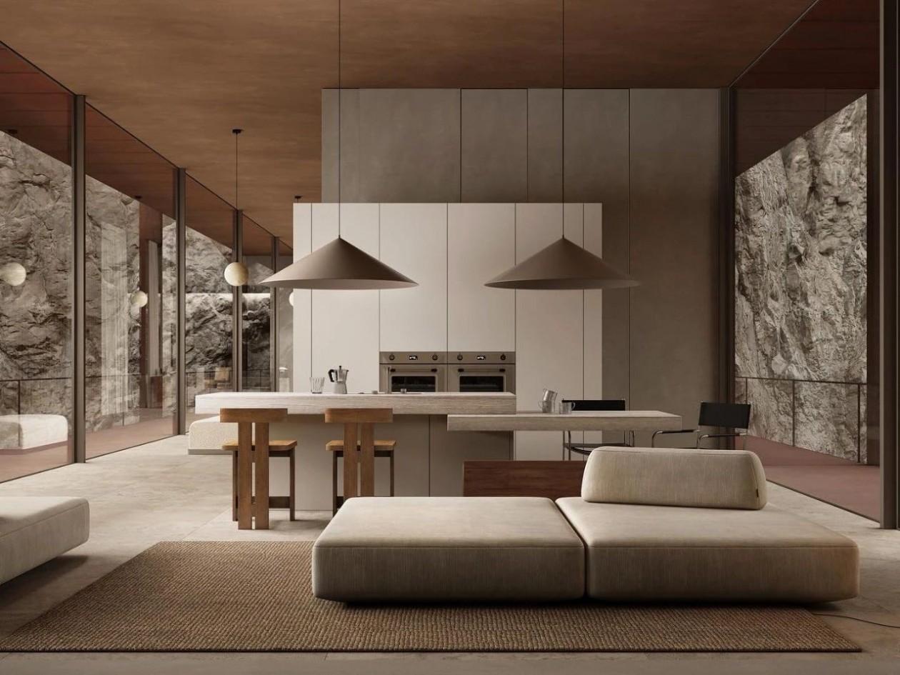 是主要的公共活动区域,包括客厅、餐厅和厨房。客厅宽敞明亮,大面积的落地窗引入充足的自然光线。咖色的皮质沙发搭配大理石茶几,简约而大气。餐厅与厨房相邻,开放式的厨房设计让空间更加开阔,中岛台增加了操作和交流的便利性。