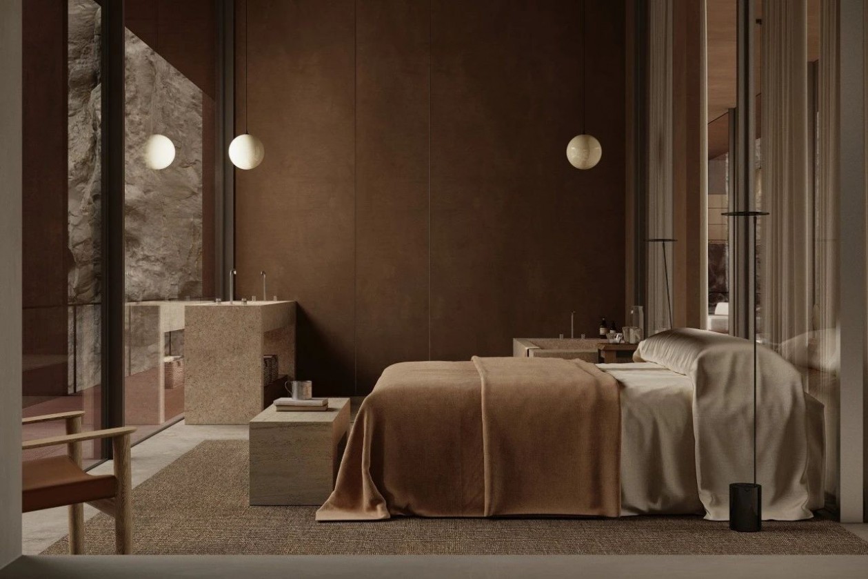 大量使用了天然石材、木材和皮革,如客厅的大理石地面、卧室的实木地板、沙发的皮质面料等,展现出高品质和自然的质感。