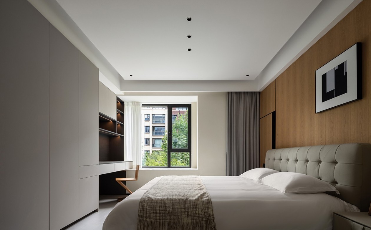 卧室是休息的空间,因此更加注重舒适性和宁静感。床头背景墙采用了原木色的护墙板,搭配柔软的米色床品,让人感到放松和安心。卧室的衣柜采用了嵌入式设计,节省空间的同时保持了整体的美观。
