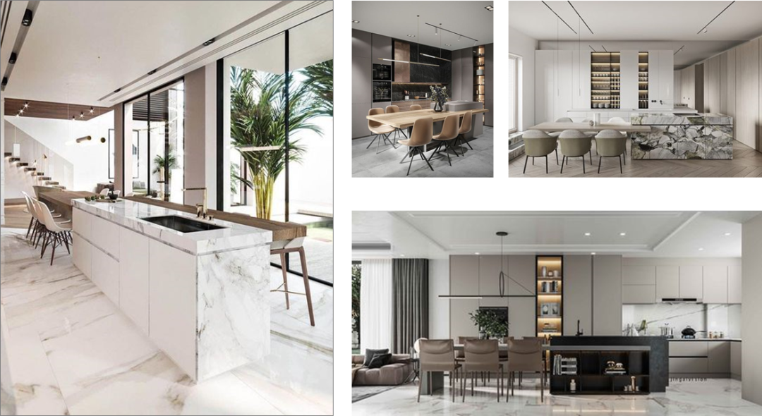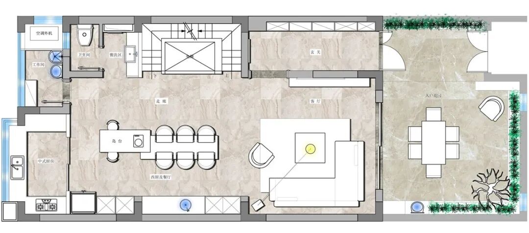一楼解决方案:就是把墙体都打掉,厨房的门也改了位置和餐厅的门直接相连,包括餐厅和客厅之间,这个墙也都打掉了,这样的话就空间感更大一些。